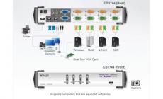 The Aten CS1744 Dual-View 4 port USB KVM Switch brings dual head video functionality to ATEN's USB KVM switch technology. Now, four dual-display computers can be accessed and controlled from a single console that consists of a USB keyboard, USB mouse, and two VGA, SVGA, or Multisync monitors.