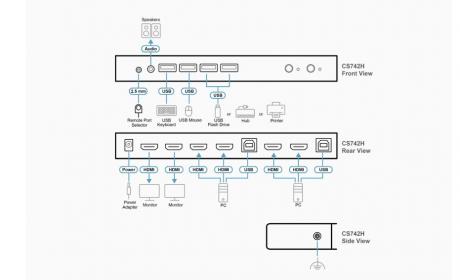 The CS742H is a 2-port KVM switch designed to boost multitasking productivity for a 2-PC, dual-display desktop. With a single keyboard and mouse, you can maintain a tidy workspace while simplifying control of two HDMI computers and two HDMI displays.