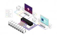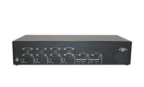 The SM-DVN-82X is a dedicated multi-platform KVM Switch capable of managing up to 8 different computers through two monitors, USB keyboard and mouse, a set of speakers, and USB devices like printers, memory devices, scanners, etc. With multi-user support, the SM-DVN-82X can accomodate up to 2 users. The video connectors on the unit are DVI-D, which allows support for HDMI using active adapters or cables. When using a DVI or an HDMI monitor, computers can be a mix of either DVI or HDMI.