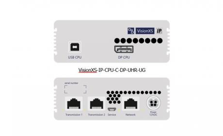 The matrix-compatible KVM-over-IP extenders of the VisionXS-IP-DP-UHR series extend keyboard, video, and mouse signals, as well as other peripheral data (e.g., audio and USB), via a standardized IP network infrastructure with CAT or fiber connection (up to 10,000 m).