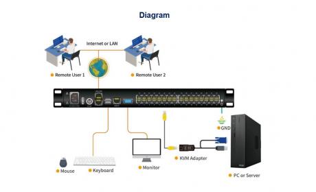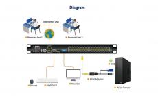 The IP-based KVM (IP-KVM) redirects the local keyboard, mouse and video data to a remote management console. The operator can safely manage one or many computers locally at the server site or remotely via a standard internet browser. Securely gain BIOS level access to systems for maintenance, support or failure recovery over the internet.