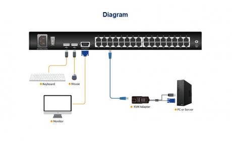 The KC series KVM switch allows access and control up to 8/16/32 computers from a single console(keyboard,mouse and monitor). As many as 256 / 512 / 1024 computers can be controlled from a single keyboard-mouse console by cascading to another 31 additional switches. The KVM switch supports USB connections for the console and computers, RJ-45 connector and CAT5e/6 cable are used to link to the computers.