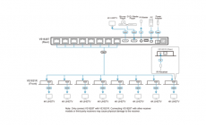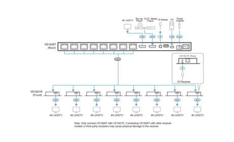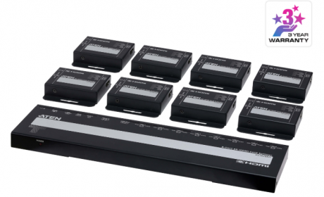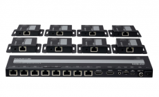 The VS1828KIT is a kit that includes 1 splitter and 8 receivers, distributing an HDMI source at up to 4K @ 30 Hz (4:4:4) to 8 displays up to 40m away via a single Cat 6 cable.