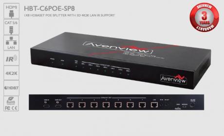 The Avenview HBT-C6POE-SP4/8 HDBaseT 1×4/8 HDMI CAT5/6/7 Splitter with PoE, Bi-directional IR and Ethernet has been design to extend 4K2K (Ultra HD), 1080p (Full HD), 3D video and multi-channel digital audio formats to (4/8) four/eight Monitors. The bonus features with this device it can support PoE (Power over the CATx cable to the RX) also Internet (100Mbps Ethernet service when connected to a Router). These features has been added to this unit to give the installer and user a complete solution with the new trends in online streaming, network connected devices and new demand in Smart TV, Ultra HD monitors and content.