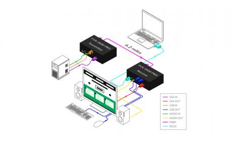 The FVX-3000-PRO is a single-mode fiber extender for VGA video, stereo audio, RS-232, and USB keyboardmouse signals. Using its powerful fiber optic technology, the FVX-3000-PRO sends 1080p (1920x1080 @ 60Hz) Full HD audio-video and keyboard-mouse signals up to 10km (6.2mi) away at lightning fast speeds without the risk of interference or interception.