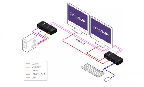 The SM-VDX-100-DH is a Dual Head VGA (1920x1200) and USB keyboard-mouse extender, sending signals up to 300 ft (91 m) away over two conventional and inexpensive CAT5/5e/6 cables. This new technology is superior to older DVI extenders that require a special CAT6 shielded cable to go a short distance.