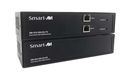 The SM-VDX-500-DH is a Dual Head VGA (1920x1200) and USB keyboard-mouse extender, sending signals up to 500 ft (152 m) away over two conventional and inexpensive CAT5/5e/6 cables. This new technology is superior to older DVI extenders that require a special CAT6 shielded cable to go a short distance.