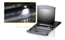 The Aten KL1508A Dual Rail LCD KVM Switch is a control unit that allows secure access to 8 computers from a single KVM (keyboard, video, and mouse) console. It consists of an integrated 17" or 19" LCD monitor, keyboard, and touchpad mouse in a 1U rack-mountable retractable sliding housing.