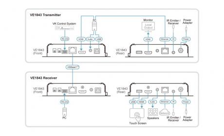 The VE1843 is ATEN ’s fi rst video transceiver and integrates the functions of a transmitter and a receiver into one unit. This combination allows users to easily confi gure the unit to be a transmitter or receiver depending on their AV solution, and to enjoy more fl exible deployment and effective use with video matrix switches, video splitters, etc.