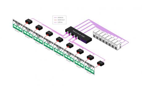 The RK8-HLX-500 is an 8-port HDMI and IR extender with a rack mounting design; it can consolidate up to 8 1080p Full HD (1920×1080 @ 60Hz) video and audio signals from HDMI sources, and send them to end-point displays up to 500 feet away via LAN with cost-effective CAT5/5e/6 cabling.