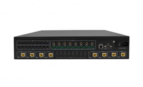 The HDR-8x8-XT is an 8x8 matrix switch that sends 4K (3840x2160 @30Hz) HDMI signals to output devices up to 328 ft away with CAT5/6 extension.