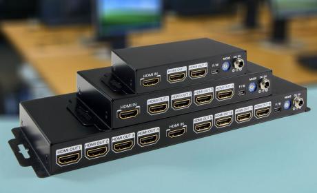 Multiple video formats to multiple screens with optional audio and serial support are available.